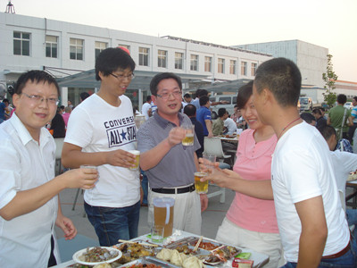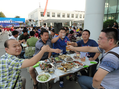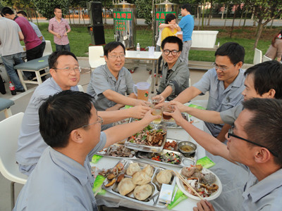 17:30分, “第四屆員工納涼晚會”正式開始。首先是員工聚餐。近400名員工,伴著歡快的樂曲聲,推杯換盞,大快朵頤。公司總經(jīng)理志賀進、常務副總經(jīng)理王正軍等公司領導走入員工中,與員工們親切交談,敬酒祝愿,整個會場洋溢著一張張歡樂的笑臉。